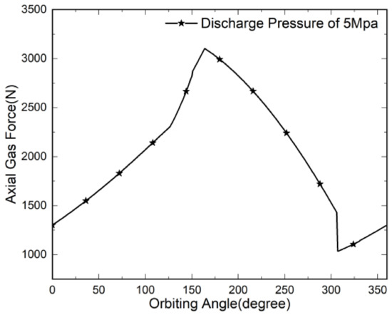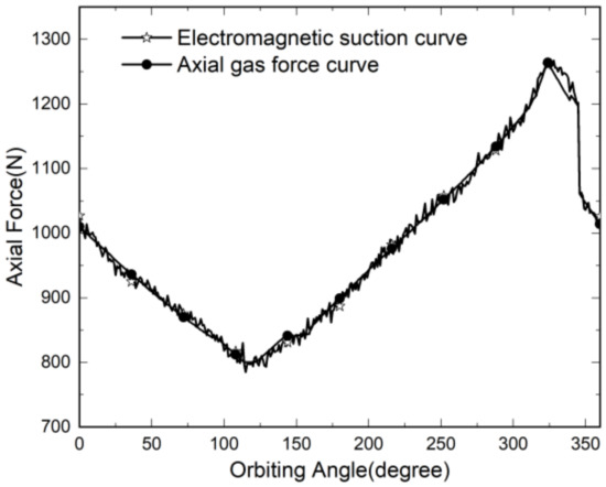 The axial separation force target curve of the scroll compressor mentioned in [27,28] is the axial gas force curve estimated by the scroll model theory, and the tangential inter-leakage, gap leakage between structures, heat energy, and friction between transmission mechanisms during the actual operation of the scroll machine, affects the air pressure and its geometric area in the air pressure chamber. Thus, the calculated axial gas force theoretically deviates from the actual force [29,30,31,32,33].