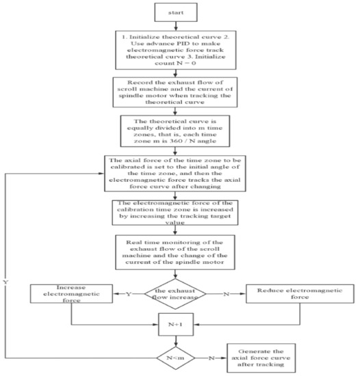 The solution methods of the compression cavity under different involutes are introduced in [10,11]. However, in the actual working process of the compressor, the volume of the compression chamber is affected by many factors; coupled with the axial force of the transmission mechanism on the scroll plate, there is a deviation between the actual axial separation force curve and the original axial gas separation force curve, which increases the difficulty of constructing the mathematical model of the scroll compressor. This paper proposes the automatic segmented control method for the target force curve searching.