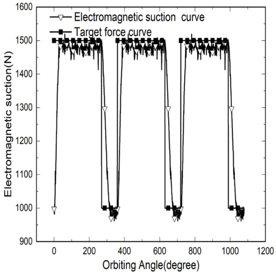 In Figure 10, the frequency of the target curve is 5 Hz, and the tracking target curve is a square wave with a maximum value of 1500 N and a minimum value of 1000 N. At this time, the adjustment time of the electromagnetic suction rise is 16 ms; the adjustment time of the electromagnetic force drop is 23 ms.