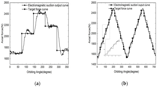 However, the electromagnet energizing circuit is similar to the RL circuit. Due to the existence of inductance, the electromagnet energizing current cannot change instantaneously with the voltage. Due to the charging and discharging time, the current needs to adjust the time from one stage value to another. According to the relationship between the electromagnetic force and current, it shows that there is a similar situation of electromagnetic suction when tracking the axial separation force of the target. The tracking step signal can reflect the dynamic response ability of the electromagnetic suction under the system; that is, the shorter the time spent from a fixed value to another fixed value, the stronger the dynamic response ability. Figure 10 shows the dynamic response capability of the current system.