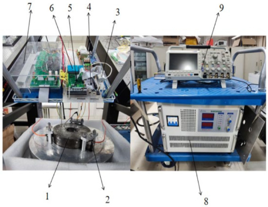 Hardware in the loop simulation experiment platform: 1—electromagnet; 2—pressure sensor; 3—DC motor; 4—controller; 5—signal acquisition board; 6—pressure transmitter; 7—drive circuit; 8—DC power supply; 9—oscilloscope.