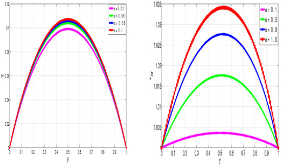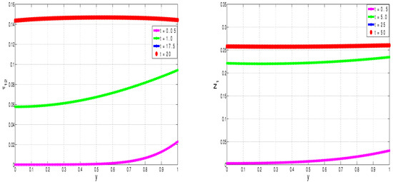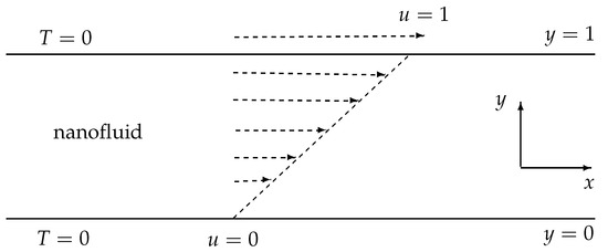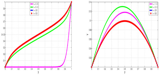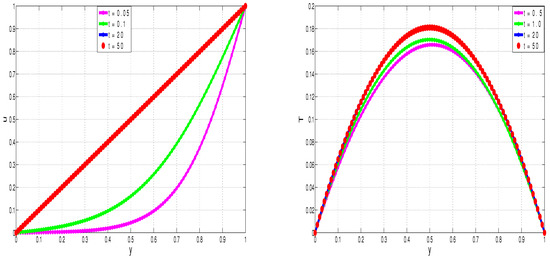 Figure 2, Figure 3, Figure 4 and Figure 5 show the development (in time) of flow quantities until steady states are reached. Specifically, Figure 2 illustrates the transient development of nanofluid velocity, u, and nanofluid temperature, T. The fluid flow is driven by shear forces acting longitudinally on the upper wall. Initially, the bulk fluid is at rest. We notice from Figure 2—as expected—that the fluid velocity develops steadily in time from the initial state until the linear shear flow profile is achieved. Similarly, the fluid temperature is initially at zero throughout the flow geometry. As the flow develops in time, the exothermic reactions and mechanical dissipation processes taking place in the bulk flow lead to inevitable temperature increases in the bulk fluid. The channel walls are otherwise maintained at isothermal temperatures. We therefore notice from Figure 2—as expected—that the bulk flow temperature gradually increases in time until steady state parabolic temperature profiles are reached.