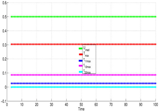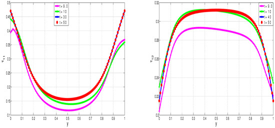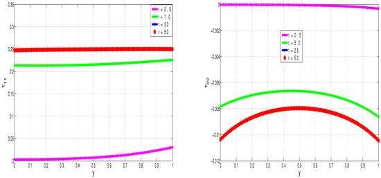 Figure 3 and Figure 4 show the time development of polymer stresses, , and, hence, also of the second normal stress difference . As with the velocity and temperature profiles, we notice that the polymer stresses converge to fixed (reproducible) steady state solutions. The fixed (reproducibility) nature of the converged steady solutions is specifically illustrated in Figure 5, where the same converged values are obtained irrespective of the subsequent time of additional computation. For example, once the solutions converge to steady-state, at say, time , then extending the computations to say, time , will not change (qualitatively and quantitatively) the steady solutions.