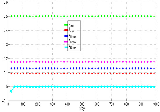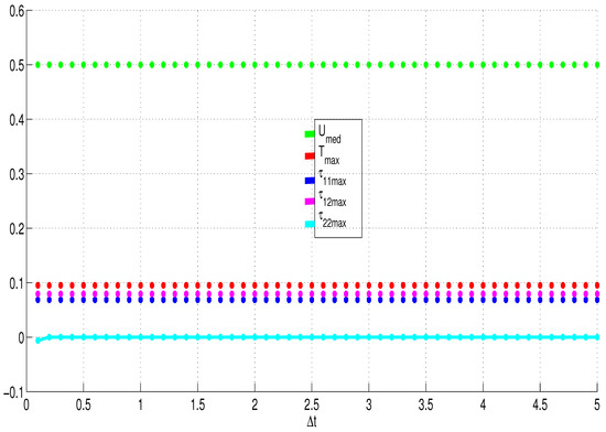 Our numerical algorithms use central differences to approximate the space derivatives. This means that our numerical schemes are second-order accurate in space. The accuracy in time is determined by the choice of . Our computational results are all obtained with . This means that our numerical algorithms (with ) are essentially first-order accurate in time. Taking, for example, , as in the Crank–Nicolson scheme, would increase the accuracy in time to second-order. The choice would however require small time-steps () to ensure that the computations converge in time. For this reason, we employ ; hence, we are free to use large time-steps, as illustrated in Figure 6. As shown in Figure 7, our numerical and computational algorithms also converge even with moderate values of the mesh-size, .