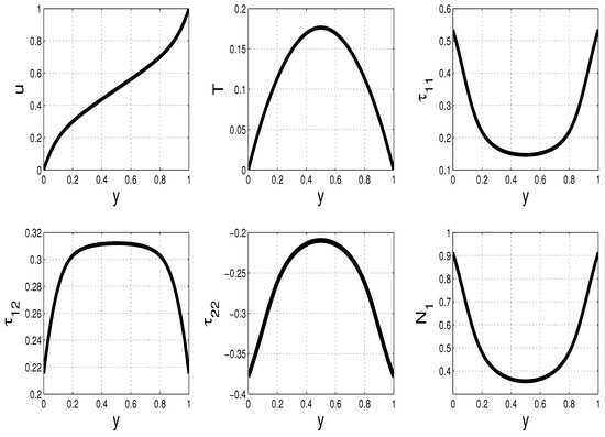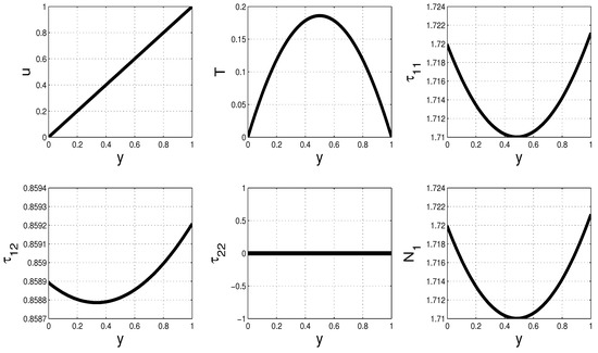 Specifically, when and in the Giesekus constitutive model, we note that the steady solutions (for the velocity u, temperature T, polymer-stresses , , , and first normal stress difference ) exhibit shear banding phenomena, see Figure 8.