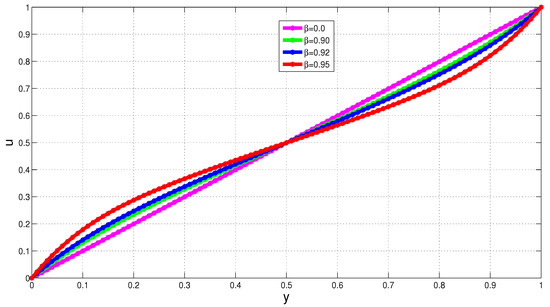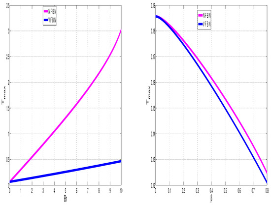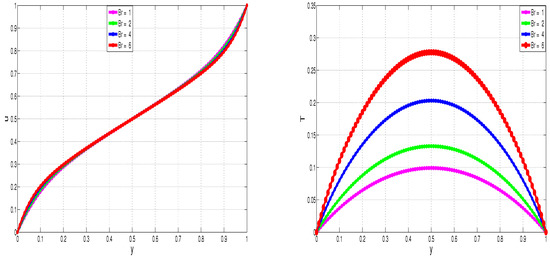 Figure 17 additionally shows, as already expected, that the nanofluid temperature increases with increasing Br, but it decreases with increasing polymer viscosity, . This further illustrates the viability of viscoelasticity (for which the polymer viscosity is a proxy) in dampening unwanted temperature increases and temperature blow-ups. As in [23], Figure 17 shows that the increase of temperature, with respect to Br, is linear for viscoelastic flow as opposed to the exponential increase observed with respect to . This therefore means that increases in Br are not expected to lead to thermal runaway in shear flow of VFBN.