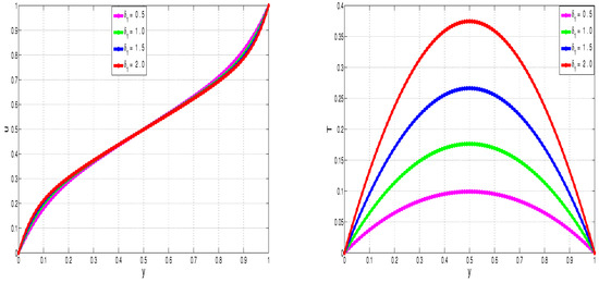 In industrial applications involving exothermic reactions, it is fundamental to ensure thermal stability and avoid thermal runaway phenomena. Thermal runaway can be demonstrated by increasing the values of the exothermic reaction parameter, . Figure 13 illustrates the effects of on the steady-state VFBN velocity and temperature, specifically the drastic increase of temperature with increasing .