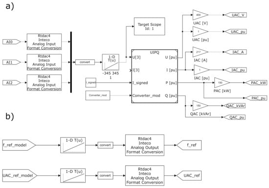 (a) Example of input signal path present in the FUC algorithm for the calculation of RMS voltages, currents, active and reactive power; (b) example of the analogue output scaling and conversion for the reference values of phase voltage and converter frequency within the FUC algorithm.
