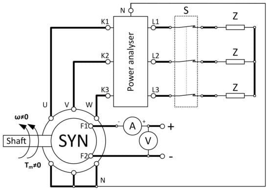 Diagram of measurement setup for synchronous generator resistive and inductive on-load transient tests.
