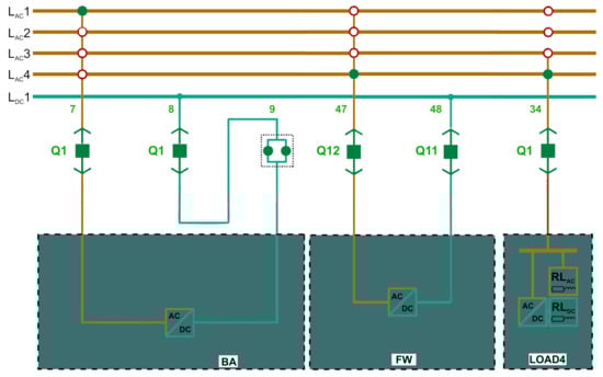 The experimental validation of the PHIL model was conducted using three functional units. The synchronous generator model was employed on a bidirectional DC/AC converter (FW) operating as a voltage source. The unit was the sole energy source with regulated voltage amplitude and frequency in the modelled autonomous power system. The FW was supplied through a DC bus with 650 V using an additional AC/DC converter, which is a part of the battery storage functional unit (BA). The BA converter was powered from the main AC bus with 400 V. To test the behaviour of the model under different scenarios the FW was connected with the LOAD4 unit, which presented a passive resistive and/or inductive load to the modelled generator. The SCADA connection diagram is presented in