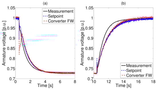 Comparison of the measured, calculated and emulated armature voltage of the synchronous generator during active–reactive load switched on (a) and off (b).