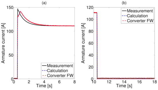 Comparison of the measured, calculated and emulated armature current of the synchronous generator during active-reactive load switched on (a) and off (b).