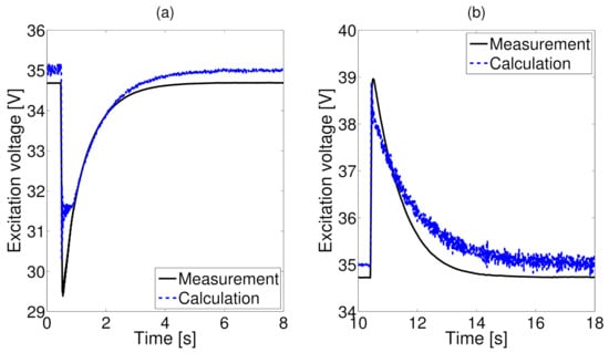 Comparison of the measured and calculated excitation voltage of the synchronous generator during active-reactive load switched on (a) and off (b).
