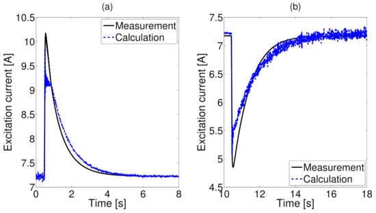 Comparison of the measured and calculated excitation current of the synchronous generator during active-reactive load switched on (a) and off (b).