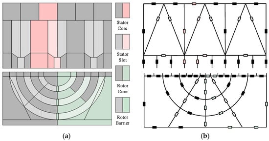 MEC model for a quarter of 12/4 SynRM. (a) 1/4 topology, (b) 1/4 MEC model.