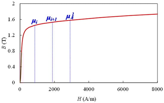 where μi is the permeance given before equation solving, and μ’i is the real permeance obtained after the equation solving, as shown in Figure 4. If ε ≤ 10−6 is not achieved, the permeance at the (i + 1)th step in an iteration is given by Equation (6) and k = 0.5 in this case.