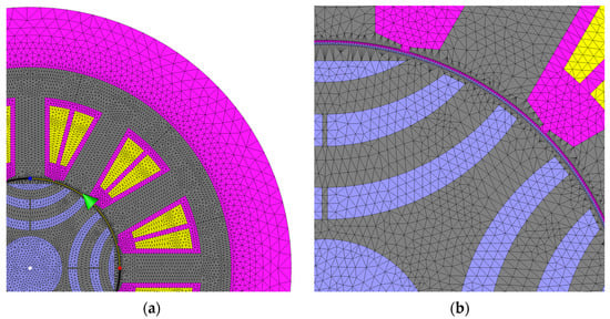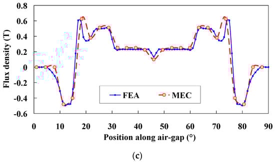 Figure 5 shows the mesh results of the FEA model in which the air-gap consists of 6 layers of elements. The path to plot the air-gap flux density distribution is also given in Figure 5a, which covers 1/4 of the air-gap. The air-gap flux density distributions generated by phase-A current, d-axis current and q-axis current, respectively, are predicted by MEC and then compared to the FEA results by Figure 6. Overall, satisfied agreements are achieved.