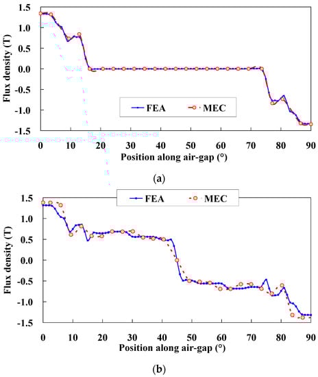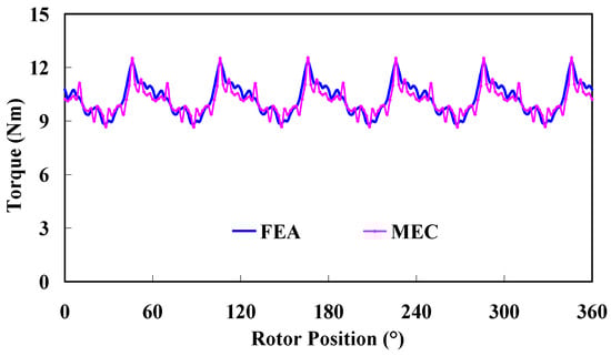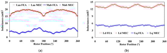 Then, the Ld (d-axis), Lq (q-axis) and Ldq (d-q coupled inductance) can be calculated by Equations (11) and (12). Figure 7 compares the MEC and FEA obtained inductances with good agreements.