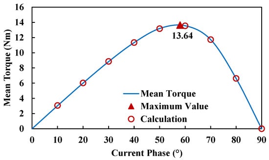 Average torque, calculation values vs. current phases when 50 A is applied.