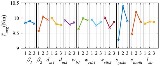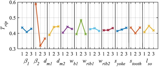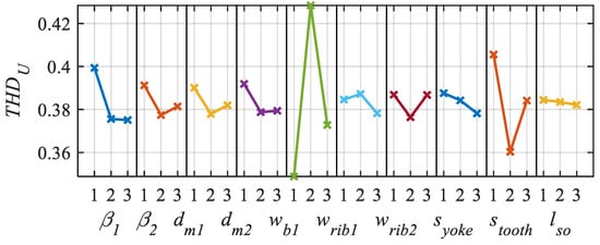 Figure 11, Figure 12 and Figure 13 present the output graph for different levels of each parameter. It can be observed that Tavg is most sensitive to Syoke and Stooth, while Trip is most sensitive to β2, wb1 and Stooth. On the other hand, wb1 and Stooth have the greatest influence on THDU.