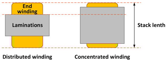 A brief comparison of the proposed 12/4 SynRM with existing state of the art is carried out. Figure 14 shows the 12/4 SynRM with concentrated winding (CW) and its counterpart, i.e., the 12/4 SynRM with distributed windings (DW). As can be seen, the end winding in the CW machine is much smaller than the DW one; thus, more laminations can be adopted when the same stack length is achieved. A higher copper fill factor and more coil turns are also obtained by the CW machine. More details regarding design specification and electromagnetic performances are given in Table 7, where the DW SynRM is optimized by a multi-object optimization method carried out on JMAG. The fault tolerant capability is evaluated by the mutual linkage coefficient kml, which is also given in Table 7.