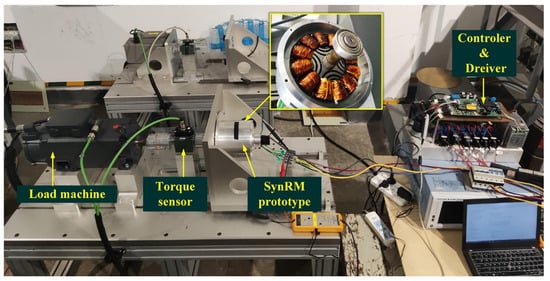 The experimental setup shown in Figure 15 consists of a prototyped 12/4 SynRM and a back-to-back load machine, which are both controlled by inverters. The load machine of the experimental platform supports the torque range of 50 Nm and the max speed of 15,000 r/min. The inverter supports the power of 30 kW/60 A. The torque sensor supports the torque range of 50 Nm/10 Nm with the accuracy of 0.1%, respectively. The torque shown in Figure 16 is measured by a sensor positioned between the SynRM and the load machine. Figure 17 compares the torque values obtained by MEC and FEA, and as can be seen, good agreements are achieved. The FEA calculated losses and efficiency is given in Table 8, and the measured efficiency under different rotor speed is presented in Figure 18.