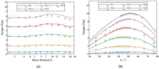 Comparison of the measured and FEA calculated torque results: (a) torque values by different current and rotor position; (b) torque values by different current and current angle.