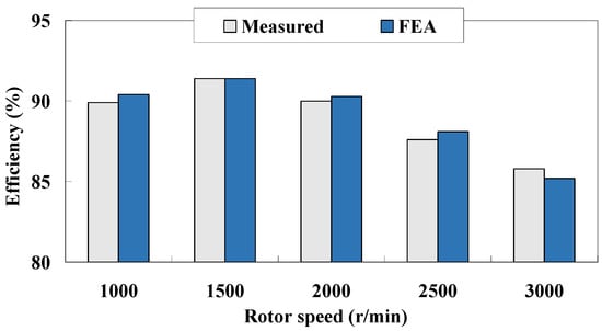 Comparison of the measured and FEA calculated efficiency by different rotor speed.