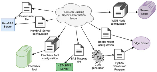 Figure 4 illustrates the different files generated from the information model specific to a HumBAS-enabled building. Apart from the generated configuration file, which defines relevant configuration parameters of the respective entities, a few entities require more specific configuration or information. For defining the HumBAS environment, an environmental file describes all entities, which includes locations and zones as well as Boolean flags for indicating possible set points. In order to set and read any data point of the BAS, a mapping file defines the relation between each of those points and the respective interface definition. Additionally, sensor data received from the WSN requires a data conversion, as described in