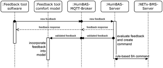 Figure 7, after the feedback tool publishes the feedback on the corresponding topic, the MQTT broker will propagate this message to the subscribed HumBAS server. The built-in rule execution engine evaluates this feedback by using the most current environmental sensor values. In case the amount of feedback tools does not exceed the threshold for an open-plan office, i.e., less than two feedback tools are within the same zone, the rule execution engine may create a command for the BAS. Otherwise, the rule execution engine needs feedback from the other feedback tools within the zone as well.