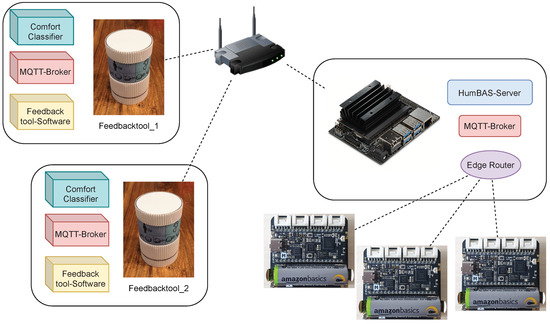 The Jetson Nano hosts the HumBAS server, an MQTT broker and the edge router for connecting the sensor nodes. Connected via the wireless router, the feedback tools publish and receive messages by establishing a communication link to the MQTT broker.