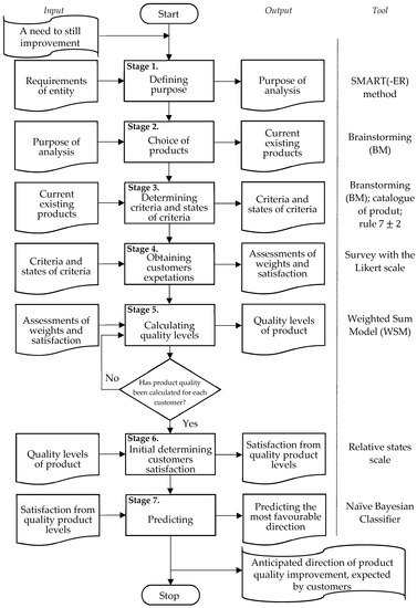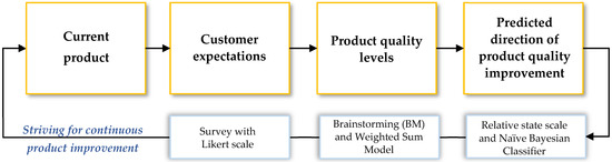 The concept of the model includes predicting the direction of product quality improvement considering customers’ expectations. It refers to determining the preferred quality of a product according to the importance of product criteria and assessment of customers’ satisfaction from states of product criteria. Therefore, the model can be useful for an entity (expert, broker, or bidder) to determine relevant improvement actions to improve currently existing products. The proposed model was developed by combining these instruments: SMART(-ER) method (S—specific, M—measurable, A—achievable, R—relevant, realistic, or reward, T—‘based on timeline’ or timebound, E—exciting or evaluated, R—recorded or reward) [32], brainstorming method (BM) [33], survey with Likert scale [1,34,35,36], Weighted Sum Model (WSM) [3,37,38,39], relative states scale [3,4,40], and Naïve Bayesian Classifier (NBC) [41,42,43,44]. The general concept of the model is shown in Figure 1.