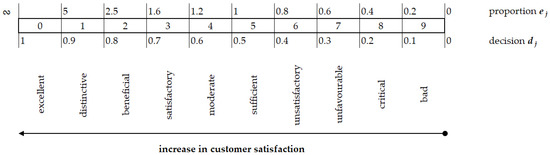 This stage relies on initially determining customers’ satisfaction from quality product levels (). It refers to marking the state of customer satisfaction for each product quality level. Following [3,4,40], it is assumed that satisfaction states are determined according to the relative state scale (Figure 3).