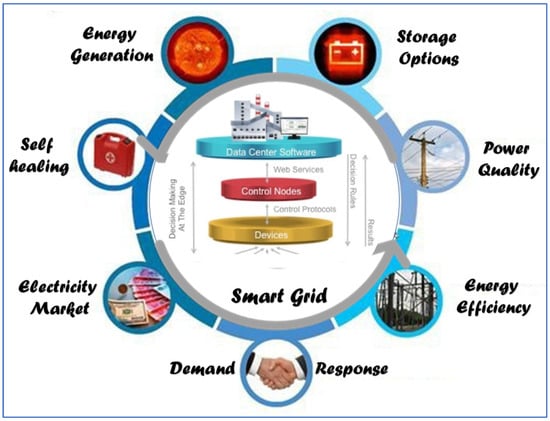 In the coming decades, electrical power control grids, confronted with decentralization, liberalization of energy, and increasing requests for high-quality and reliable electricity, will come under stress in trying to provide energy according to these needs []. The use of a Smart Grid (SG) is considered a promising approach to coordinate these upcoming needs. Energy management has been investigated as one of the foremost and most complicated optimization problems in power control systems. In [,,], practitioners proposed different approaches for efficiently managing the energy by using a smart grid with optimal power dispatch, scheduling of efficient home electrical appliances, and using metaheuristic approaches to solve energy resource-management-related problems in an SG to attain better performance, respectively. SGs provide bidirectional or two-way communication to manage electricity demand and provide communication between the utility and consumer, and this communication is used for energy optimization which permits more productive energy generation and distribution through better communication and information.