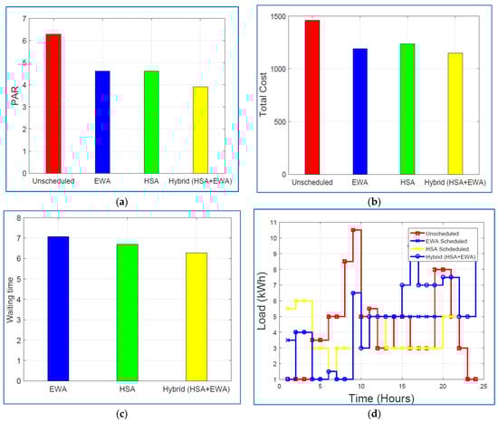 In the 60 min OTI, the performance of the hybrid approach (EHSA) was better than that of the HSA and EWA with RTP. HSA and EWO also outperformed the unscheduled appliances. Cost and PAR were decreased, and in terms of load energy consumption, the hybrid approach, HSA, and EDW reduced load during peak hours. Peak hours were determined from 17 to 23 according to the 60 min OTI and 24 slots. The results of the hybrid approach (EHSA), HSA, and EWA were gathered. The EHSA minimized the Peak-to-Average Ratio (PAR) effect on the cost, as shown in Figure 4a. EHSA and EWA reduced the energy consumption and load during peak hours in order to decrease the electricity bill cost of the user, as shown in Figure 4b. The cost value of EHSA was 1100 and that of EWA was 1200, and the waiting time of EWA was increased compared to those of HSA and EHSA. EHSA performed better in terms of user comfort, as shown in Figure 4c. Figure 4d shows that the load was reduced or shifted during peak hours to reduce the cost. The hybrid technique of both EWA and HSA showed that in 60 min OTI, the cost of the hybrid and EWA approach was reduced but the waiting time of EWA was more as compared to the hybrid technique EHSA. The results reveal that EHSA performed better in terms of user comfort and cost.