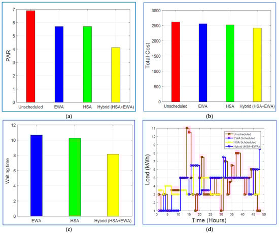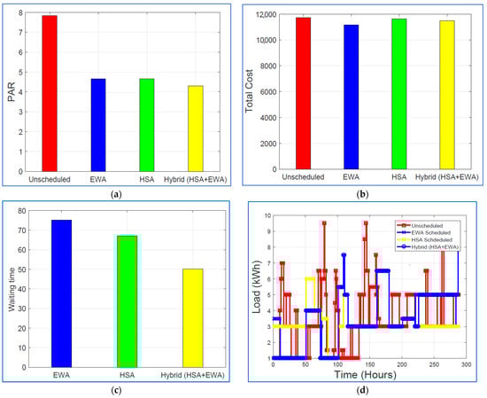 Simulations and results for 30 min OTI showed that the performance of the hybrid approach was better in terms of PAR, cost, and user comfort, as shown in Figure 5a–c. The hybrid technique EHSA with RTP performed better as compared to the EWA, HSA, and unscheduled appliances. The cost and PAR of EHSA were reduced as compared to EWA and HSA. In terms of cost, HSA performed well as compared to EWA, both metaheuristic techniques performed better as compared to the unscheduled pattern, and in load energy consumption, EHSA, HSA, and EWA reduced load during peak hours, as shown in Figure 5d. Peak hours were from (07:30 to 17:30) according to 30 min OTI and 48 slots. Results show that when using EHSA, HSA, and EWA with 30 min OTI, EHSA, EWA, and HSA reduced the energy consumption and load during peak hours to produce a decrease in the electricity bill cost of the user. However, the hybrid technique performed better than both of the metaheuristic algorithms by achieving a cost value of 2400 with minimum PAR value, as shown in Figure 5a,b, respectively. The waiting time of HSA and EWA was increased, while EHSA performed better in the form of user comfort, as the simulation results of 30 min OTI show in Figure 5c.