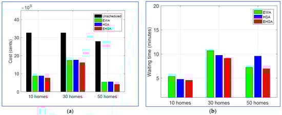 We evaluated the results of our proposed hybrid technique EHSA and collected results for our proposed scheme across multiple homes, comparing it with EWA, HSA, and unscheduled to find the differences between the cost and user comfort level. We applied our hybrid technique on 10, 30, and 50 homes with the goal of minimizing the total cost and maximizing the user comfort level via load management during peak hours, as shown in Figure 7a,b, respectively.