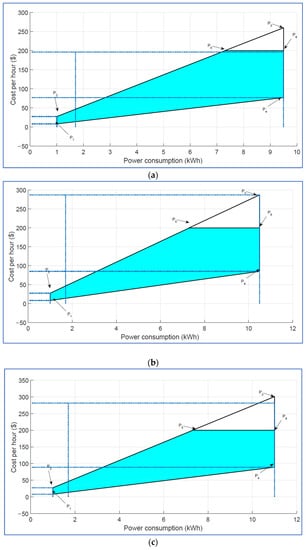 A feasible region is a defined area defined by a set of points where the objective function satisfies the result. The problem’s restrictions are a small number of specified points. We found the feasible region of a cost function for multiple houses in this paper. As demonstrated in Figure 8, the feasible region of the objective function minimizes cost by minimizing energy consumption. Figure 8 shows the feasible region for single, 10, 30, and 50 houses in Figure 8a–c, respectively. All viable solutions were covered according to the fitness function. The feasible region, also known as the search space, is a region defined by a subset of all optimization problems. The overall cost region is shown by points P1 (0.600, 15.02), P2 (26.00, 31.08), P3 (200.0, 251.3), P4 (198.0, 201.0), P5 (210.0, 221.3), and P6 (211.0, 219.0), where P1 (0.600, 15.02) is the cost of electricity when the minimum load is set at the lowest price. The objective function remains the same; however, because of the increased number of houses, the constraints are changed, where the objective function satisfies the result and a few specific points are the constraints. The feasible region reveals that cost is diminished with a desirable waiting time. The cost of electricity in this region at any time slot is reasonable and contributes to the reduction of total electricity costs.