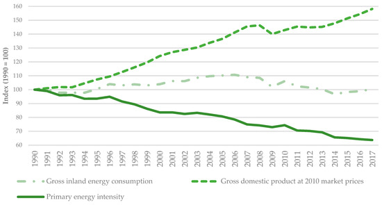 Trends in energy intensity, gross domestic product, and gross inland energy consumption in the European Union (created using data from [15]).