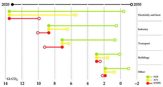 International Energy Agency (IEA) estimate of the evolution of CO2 emissions between 2020 and 2050 considering three different scenarios. Adopted from [39].