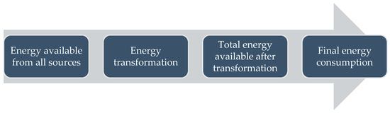 In this context, the year 2020 was marked by the strong negative impact of the COVID-19 pandemic on economies around the world, and Portugal was no exception. The effects resulting from the mandatory confinement led to a strong contraction of most branches of economic activity, determining in some cases an almost total stoppage. As a result, routines change, and energy consumption in offices and commercial buildings was moved to residential buildings and consumption in transport had significant drops, especially in international aviation, with less than 64% of oil equivalent (ktoe) consumed, and road transport where the stoppage was a reality, with less than 16% consumed. In this context, the year 2020 is a very atypical year for the intended analysis to be carried out, so, the analysis carried out with Eurostat data, regarding the energy balance of Portugal, covered the period from 1990 to 2019, and the relationship between decarbonization and electrification of the energy sector was mainly focused on the year 2019. The analysis of all energy sources that make up the energy mix of Portugal was carried out, with their units being standardized to kilotonnes of oil equivalent (ktoe). The adopted analysis method included the analysis of four different phases of the energy balance, as presented in Figure 4.