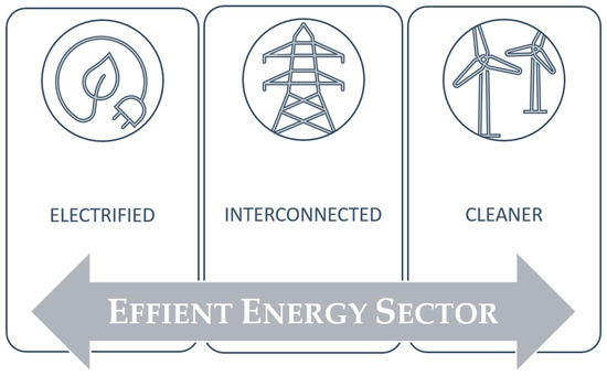 In 2020, even in a scenario where world economies retreated or stagnated due to COVID-19, the implementation of new infrastructure projects based on renewable energy sources, such as wind and solar photovoltaics, continued to grow at a good pace and electric vehicles reached new sales records [39]. The decentralized use of renewable energy sources, especially in the residential sector, is also growing in many developed countries [47]. Therefore, a new energy system (Figure 5) will be based on a more electrified, efficient, interconnected, and cleaner energy sector [39,41,42,48,49].