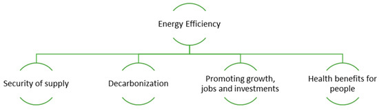 With the energy transition on the doorstep to a decarbonized economy [34], the role of electrification is essential, however, it can never be fully implemented without energy efficiency being the priority. This results not only from the implementation of the principle of “Energy Efficiency First”, but because a set of opportunities for energy efficiency in buildings, transport, and industries [35] will allow energy savings by switching from inefficient fossil fuel technologies to more efficient electrical technologies, while at the same time, they also provide financial, environmental, health, and property benefits.