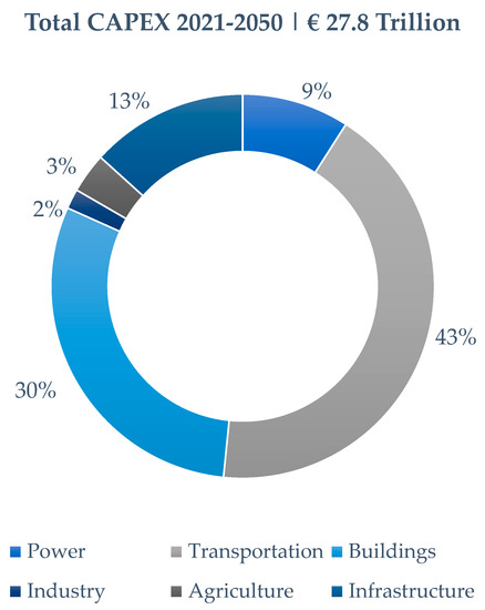 In this context, there are different ways and scenarios to achieve the objective of decarbonizing the energy sector. Focusing only on the European case (EU-27) estimates made in 2020 [137] predict that the investment challenge to reach the net-zero goal by 2050 will be around €27.8 trillion over 30 years in six different sectors (Figure 7). The projections went even further, disaggregating the total value of CAPEX in Europe by a decade, given the proposed objectives for the 2030 and 2050 horizon, with investment between 2021 and 2030 amounting to around €8.4 trillion. However, to reach the net-zero goal in 2050, member states will have to make a joint effort in the amount of approximately €19.4 trillion, and between 2031 and 2040, the investment is expected to be slightly higher, making a total of €10 trillion, compared to €9.4 trillion of the total CAPEX in EU-27 between 2041 and 2050.