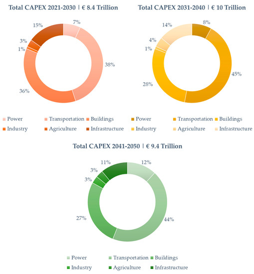Total CAPEX in EU-27, broken down by sector per decade, for the period 2021 to 2050 (created using data from [137]).