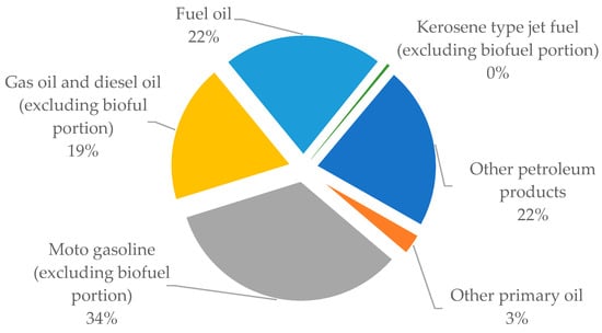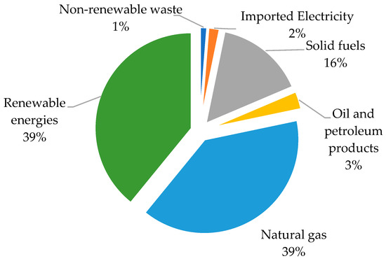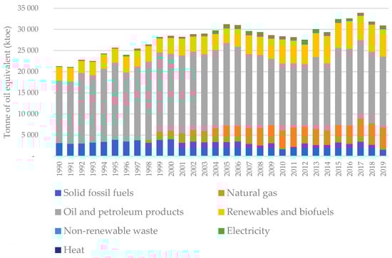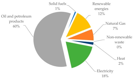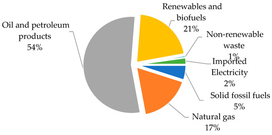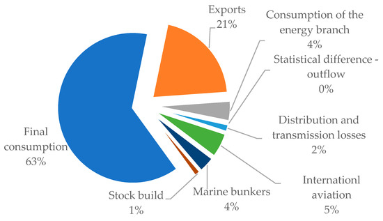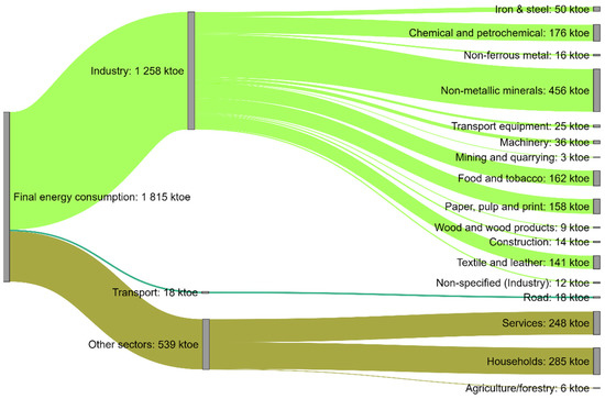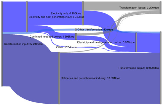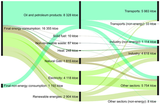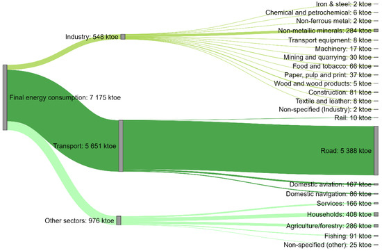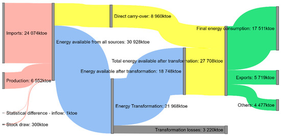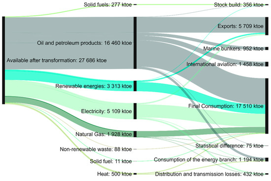 Figure 9 presents the Portuguese energy balance flow according to the four previously mentioned phases and demonstrates that Portugal is heavily dependent on imported energy since, in 2019, energy imports accounted for 78% (24,074 ktoe) of the energy available from all sources. Additionally, 21% (6552 ktoe) of the available energy is extracted from Portugal’s natural sources. However, there are 10% (3220 ktoe) losses in the energy transformation, a significant value in the context of decarbonization. After transformation, from the total energy available, with Portugal using 63.24% (17,511 ktoe) for final energy consumption, exports 20.62% (5719 ktoe) and 14.58% (4045 ktoe) of the available energy is used in the stock build-up, in international aviation and navigation, to operate installations for energy production and transformation and some minor miscellaneous uses. In this phase, there are also energy losses related to electricity transmission and distribution with a weight of 1.56% (432 ktoe).