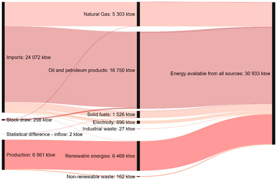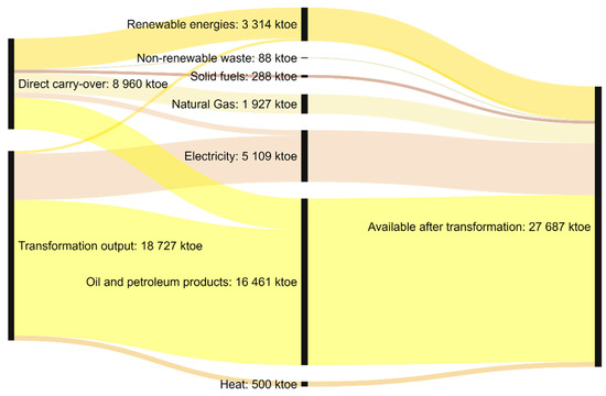 The “energy available from all sources” phase, includes the energy vectors of generation, imports, stock draw, and inflow of statistical difference (represents the negative statistical difference, that is the negative difference between the energy available for final consumption and final consumption). Regarding the “energy transformation” phase, it includes the energy input to all transformation processes (for example, crude oil, natural gas) and energy obtained as a result of all transformation processes (for example, refined petroleum products, electricity, or heat). The third phase is the “total energy available after transformation” phase, which intends to represent the disaggregation of the different energy vectors after the energy transformation carried out in Portuguese territory and the amounts of energy that do not suffer any transformation process (i.e., primary energy used directly in final consumption). Therefore, this phase represents the amounts of energy that are available for use. The last phase represents the breakdown of “final energy consumption” of all fuels used for energy purposes in the sectors of industry, transport, residential, commercial/services, agriculture, fishing, and other sectors on the one hand, as well as certain fuels used for non-energy purposes.