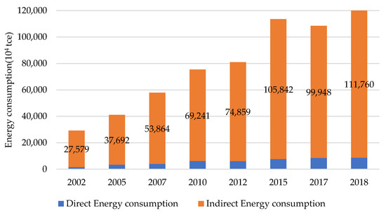 The direct and indirect energy consumptions of the Chinese construction sector in 2002–2018.