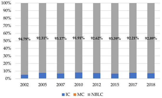 According to Equations (11)–(14), Figure 2 shows the VICE (the total energy consumption to satisfy the final demand) composition of the construction sector. It can be noted that more than 91% of the VICE in the construction sector comes from NBLC. This high NBLC ratio indicates that a significant part of the directly and indirectly energy consumed by the construction sector comes from inflows from the other blocks in 2002–2018. Between 2002 to 2018, the value of internal consumption was stabilizing at a low value less than 8.1%. The low internal consumption, demonstrating significant non-dominance of internal consumption in the construction sector. Additionally, the value of mixed consumption of the construction sector was less than 0.09% in 2002–2018. Similarly, the low mixed consumption reflects that the energy consumption component associated with the participation of the construction sector and other blocks is the least.