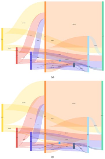 The net flow paths and volumes of energy consumption in different sectors of China (104 tce). Note: (a) Shows the net flow of energy consumption in 2018. (b) Shows the average of the net flow of energy consumption between 2002 and 2018. Colors indicate the eight different sectors. Energy consumption flows from the sectors on the left to the sectors on the right. The width of the line represents the volumes of energy consumption net flow, and the specific volumes are shown in the middle.